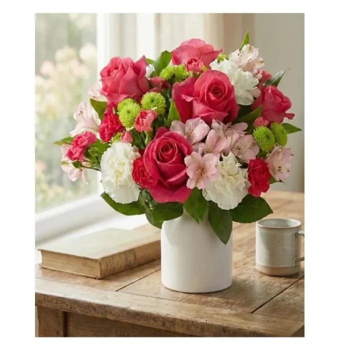 Armoniosa composición de 12 rosas, 6 claveles, 6 flores blancas y follaje natural en florero elegante, diseñada para expresar cariño, gratitud y romanticismo. Ideal para aniversarios, cumpleaños y ocasiones especiales. Incluye tarjeta personalizada.