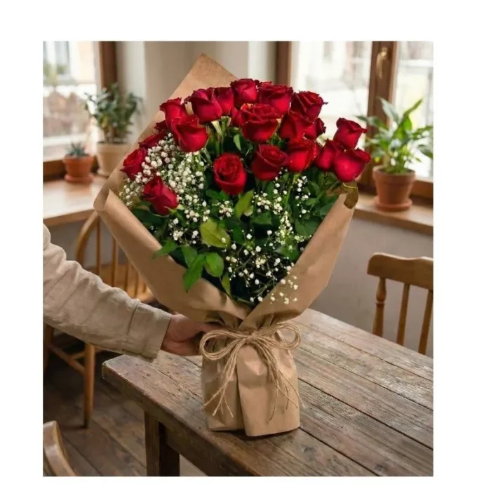 Ramo de 24 rosas rojas acompañado de follaje natural. Diseñado para expresar amor, admiración y romanticismo en aniversarios, cumpleaños y momentos especiales.