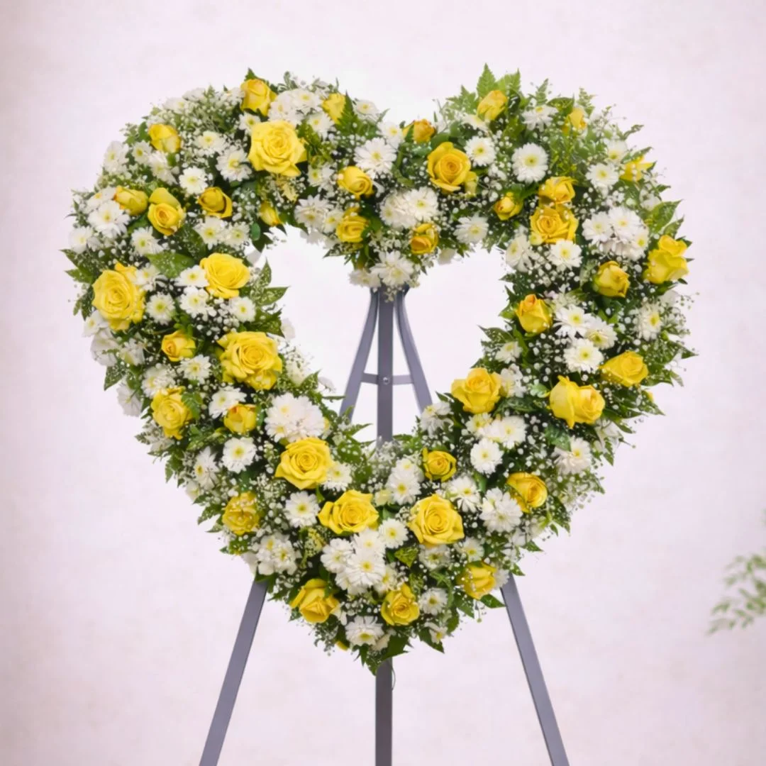 Un homenaje lleno de luz y gratitud. Corona funeraria en forma de corazón elaborada con rosas amarillas y delicadas flores blancas, cuidadosamente dispuestas para transmitir cariño, respeto y recuerdo eterno. Entrega el mismo día en Ciudad de Guatemala y Mixco.