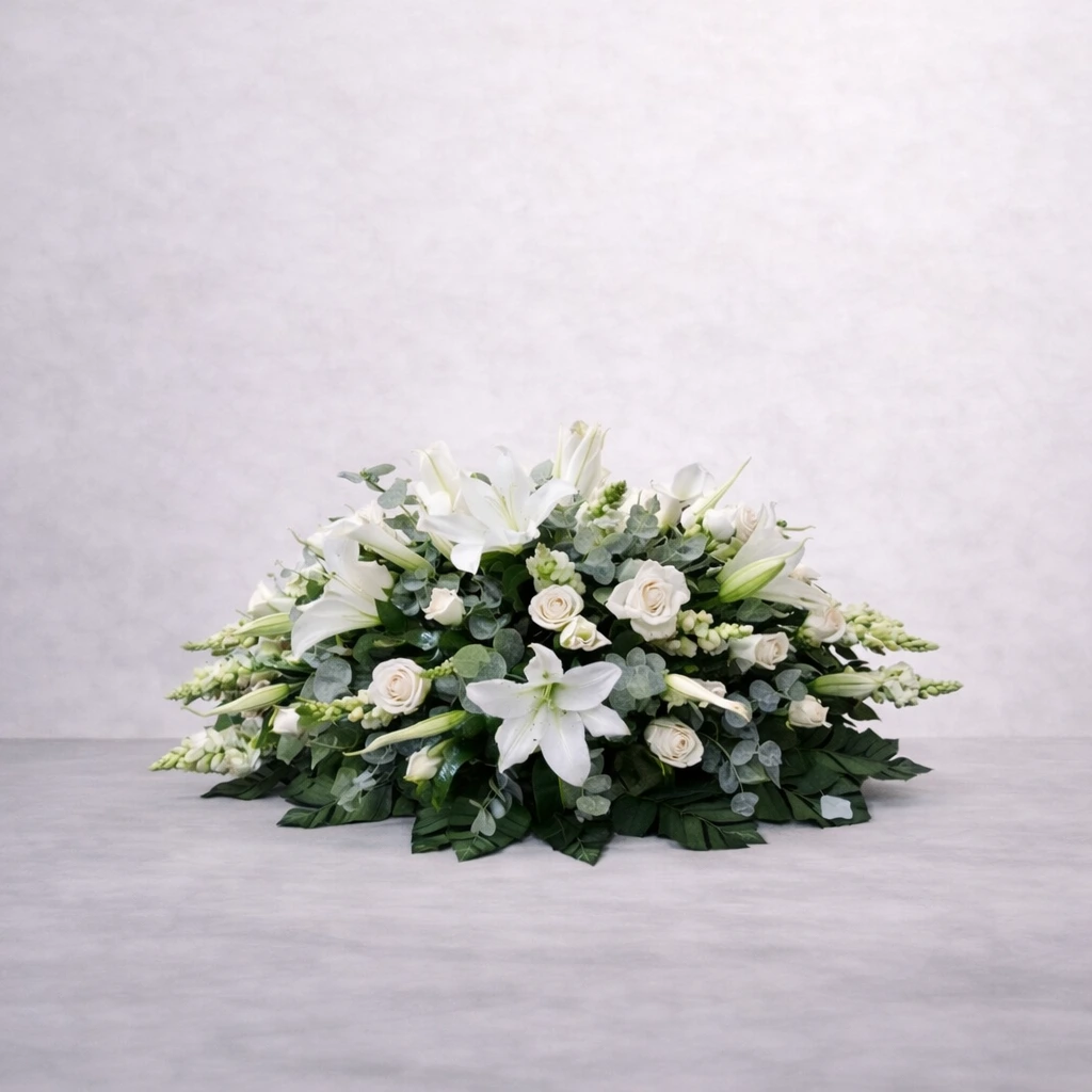 Arreglo floral para funeral, hecho con lirios y rosas blancas, símbolo de pureza y respeto, ideal para funeral o velorio como muestra solemne de amor y despedida.