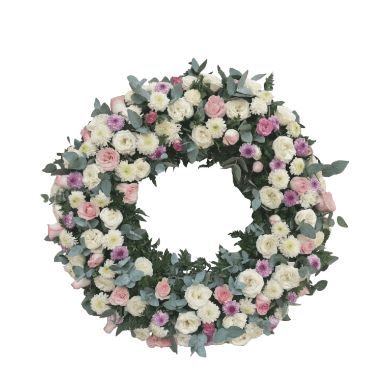 Corona de rosas y crisantemos en tonos suaves, hecha con flores frescas, ideal para homenajear a una mujer en funeral o velorio como homenaje de paz y gratitud.
