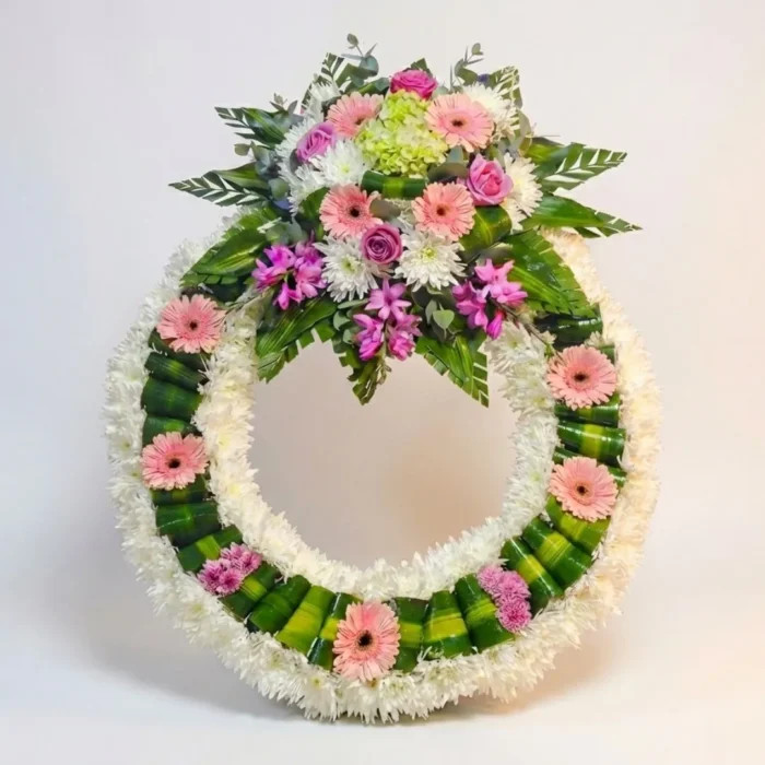 Corona fúnebre elegante en tonos blancos, hecha con flores frescas seleccionadas. Un homenaje sereno y respetuoso. Entrega el mismo día en Ciudad de Guatemala y Mixco.