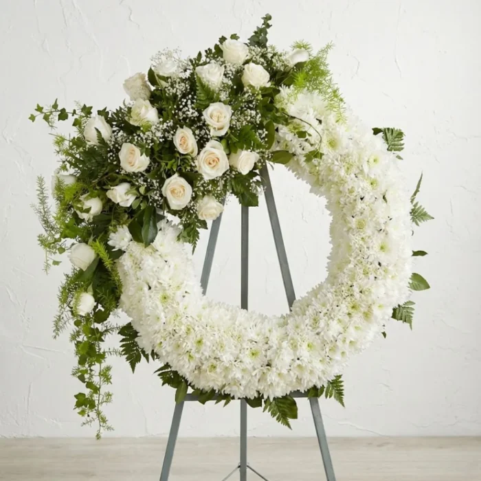 La opción ideal para presentar tus respetos de manera elegante y accesible. Con una base circular blanca y un detalle lateral de rosas y follaje, este arreglo transmite solemnidad y apoyo. Entrega el mismo día en Ciudad de Guatemala y Mixco.