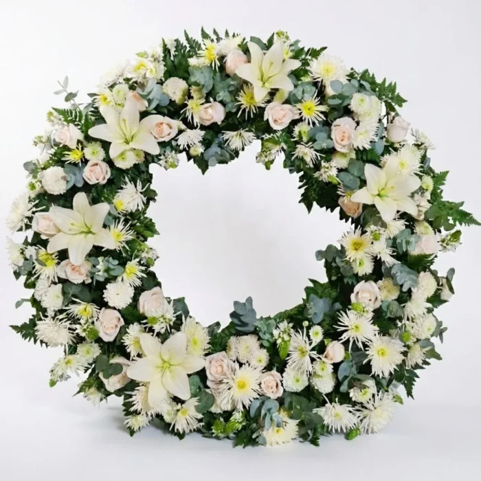Corona de lirios y rosas blancas que simboliza la luz perpetua. Diseño sobrio y elegante disponible en 3 tamaños para entrega en  Guatemala. Entrega el mismo día en Ciudad de Guatemala y Mixco.
