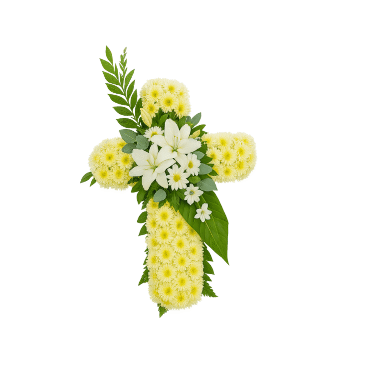 Cruz floral con lirios y crisantemos blancos sobre fondo amarillo, símbolo de fe y esperanza, ideal para funeral o velorio como homenaje solemne.