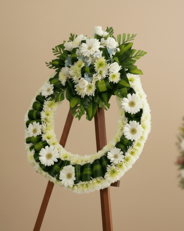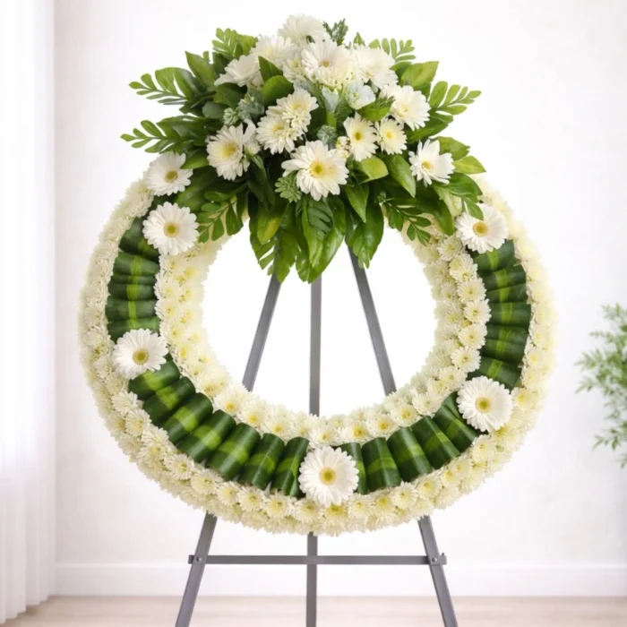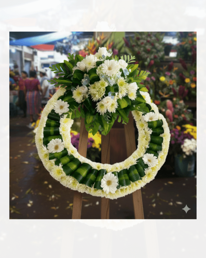 Corona fúnebre elegante en tonos blancos, hecha con flores frescas seleccionadas. Un homenaje sereno y respetuoso. Entrega el mismo día en Ciudad de Guatemala y Mixco.