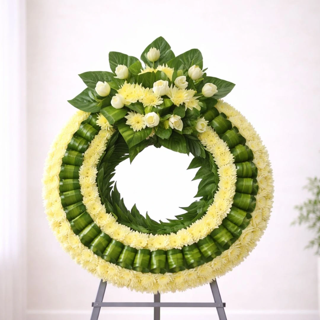Corona de rosas blancas y detalles en verde, símbolo de paz y esperanza, ideal para velorio o funeral como muestra solemne de respeto.