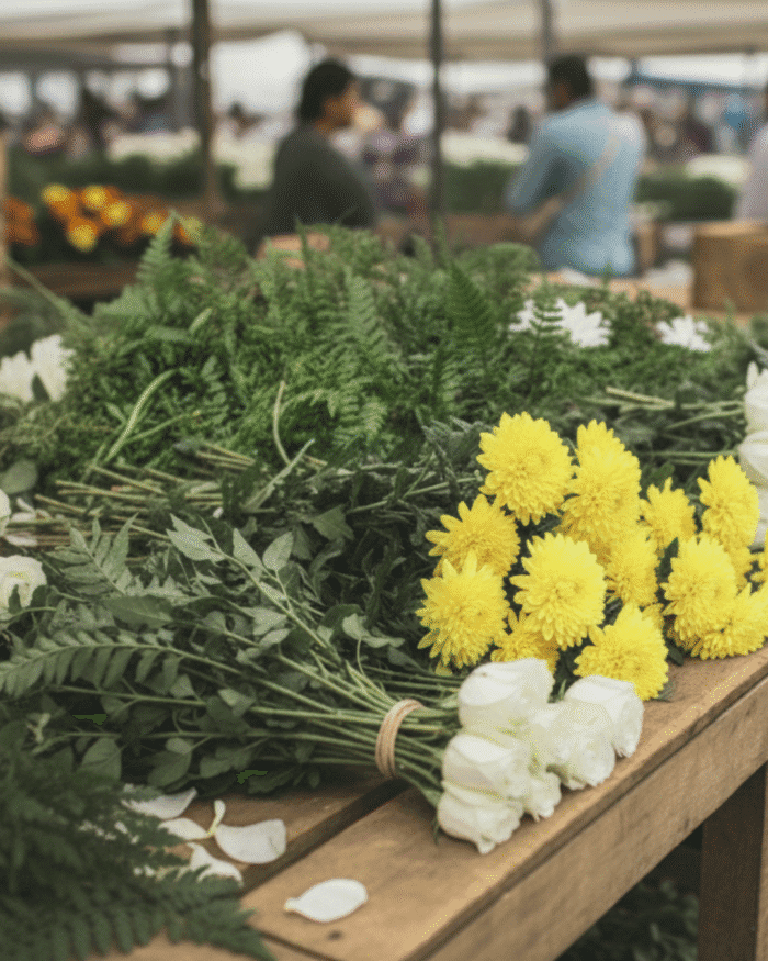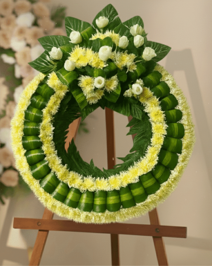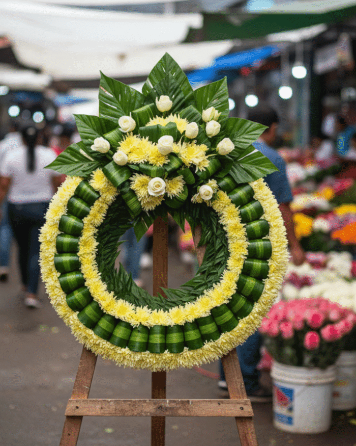 Corona de rosas blancas y detalles en verde, símbolo de paz y esperanza, ideal para velorio o funeral como muestra solemne de respeto.