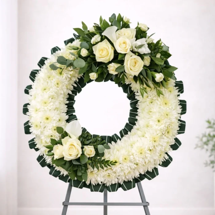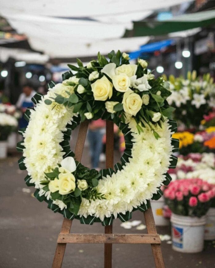 Corona elegante de rosas y crisantemos blancos, hecha con flores frescas, para expresar paz, amor y respeto en velorio o funeral.